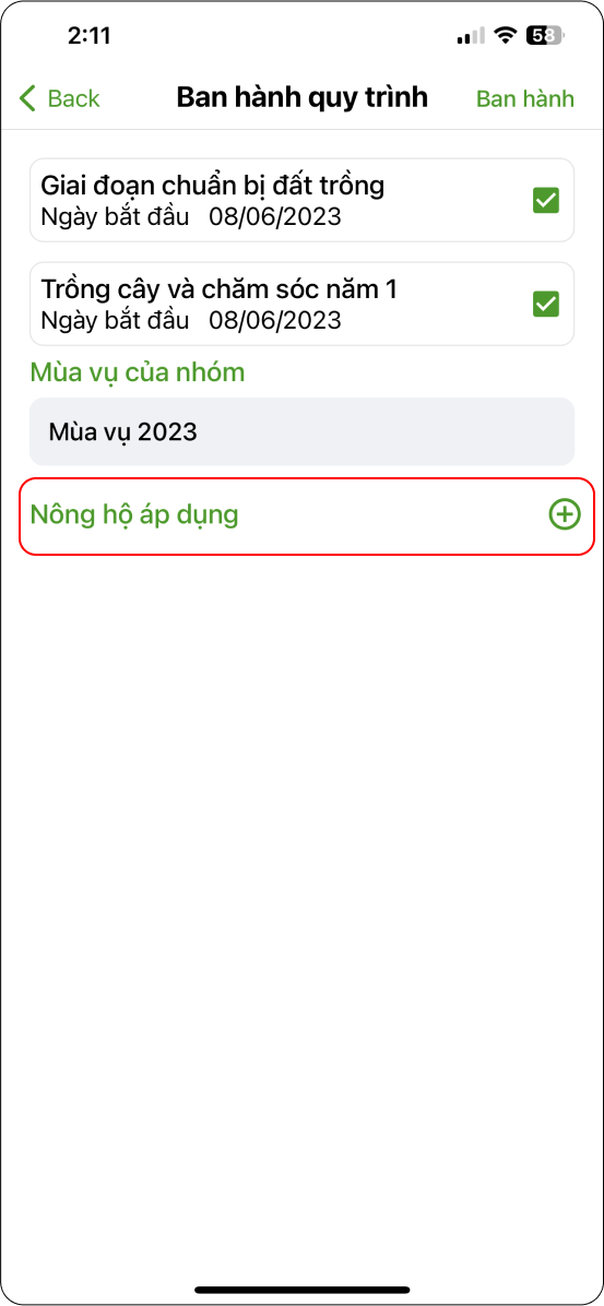 → Ấn chọn biểu tượng dấu cộng (Hình 3) → Tích chọn nông hộ tham gia mùa vụ (Hình 4) → chọn biểu tượng tắt của số khi hoàn thành (Hình 4).