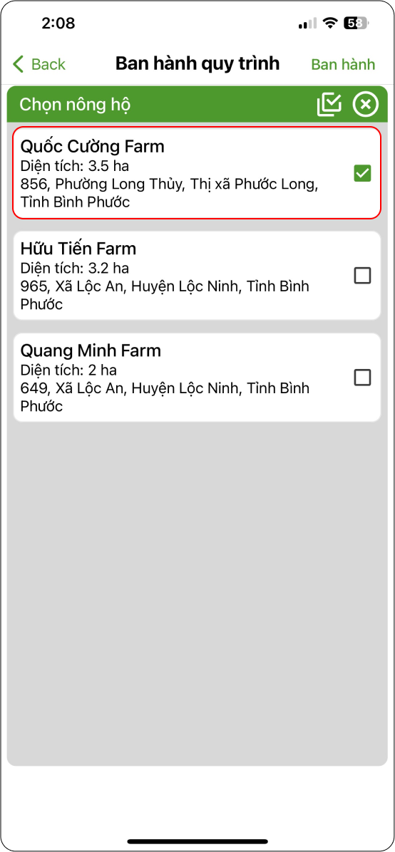 → Ở trạng thái đang tiến hành, chọn trang trại cần đánh giá (Hình 3)