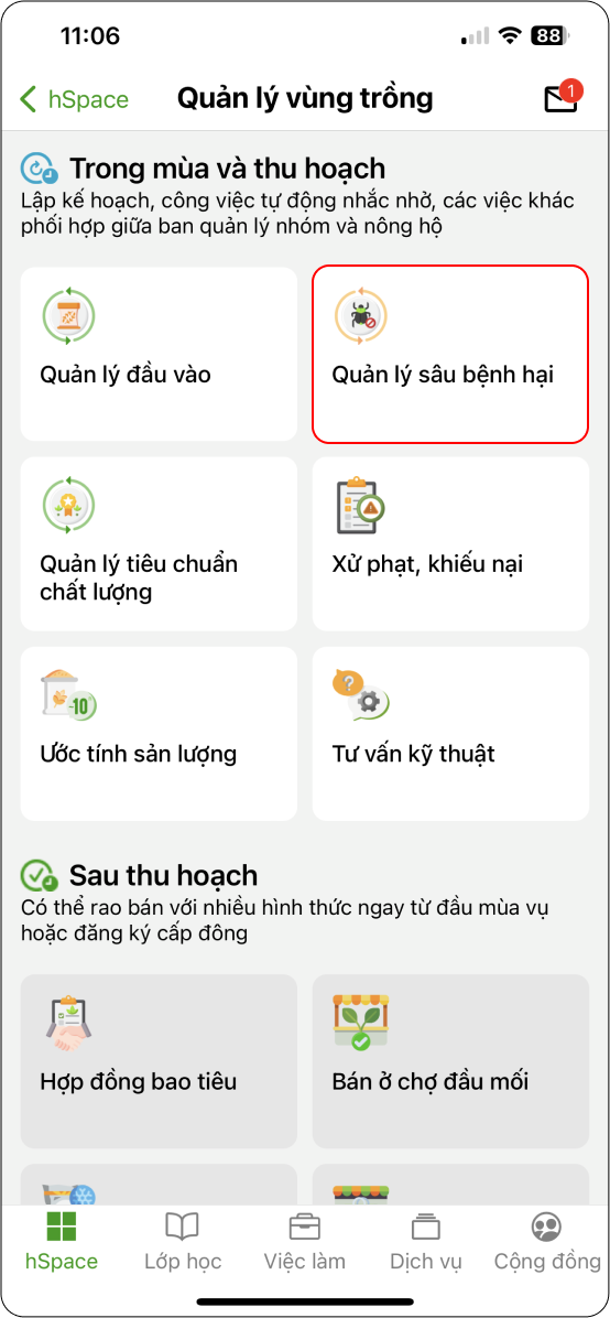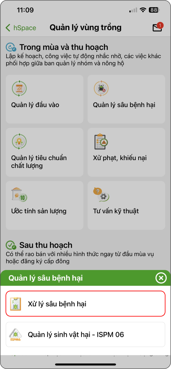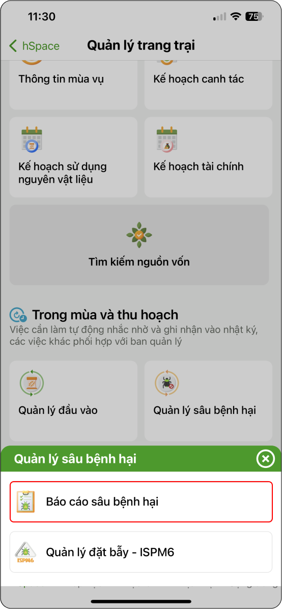 B4: Chọn “Quản lý sâu bệnh hại” (Hình 1) → Báo cáo sâu bệnh (Hình 2)
