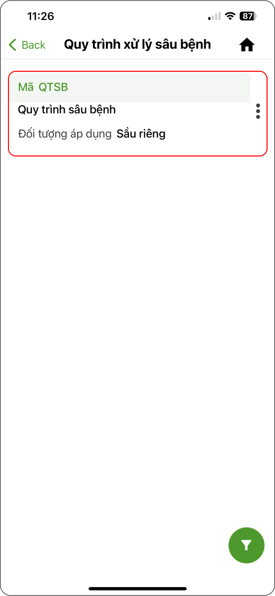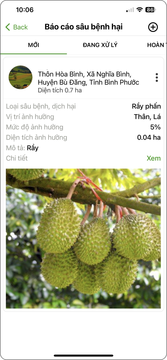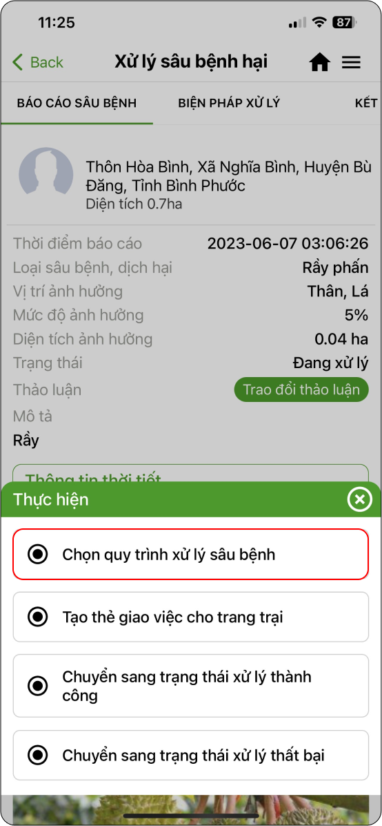 Truy cập chi tiết báo cáo sâu bệnh (Hình 4 - Bước 4) → Chọn biểu tượng đa nhiệm (Hình 1) → Chọn quy trình xử lý sâu bệnh (Hình 2).