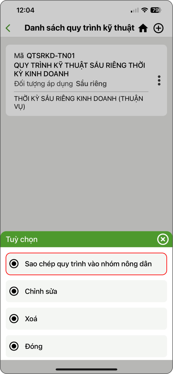 B2: Nhấn vào “dấu 3 chấm” trên quy trình cần sao chép (Hình 1) → Nhấn vào “Sao chép quy trình vào nhóm nông hộ” (Hình 2) → Chọn nhóm cần sao chép quy trình đến (Hình 3).