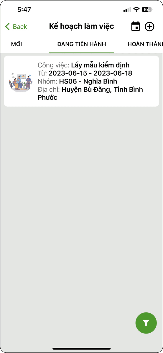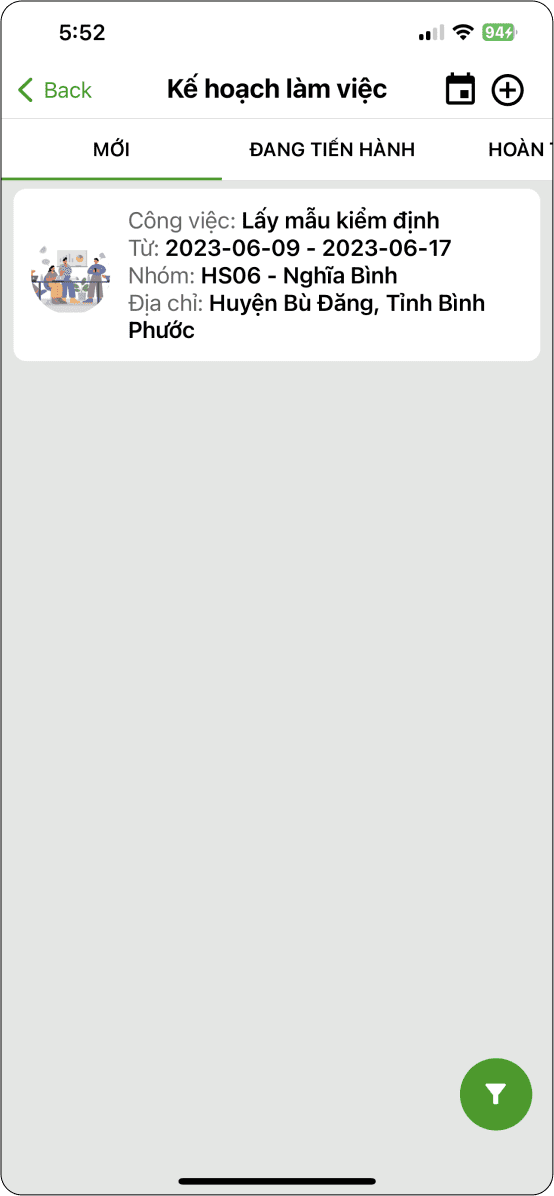 B5: Tại màn hình chi tiết kế hoạch lấy mẫu (Hình 1) → Chọn biểu tượng đa nhiệm (Hình 1) → Chuyển sang trạng thái đang tiến hành (Hình 2) → Hoàn thành chuyển trạng thái đang tiến hành lịch làm việc Lấy mẫu kiểm định.