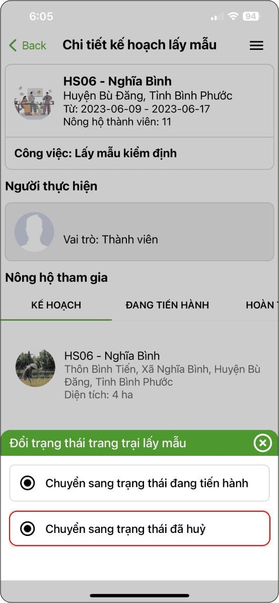 B6: Tại màn hình “Chi tiết lấy mẫu” (Hình 1) → Chọn Trang trại thực hiện lấy mẫu (Hình 1) → Chọn “Chọn chuyển trạng thái Hủy” (Hình 2) → Hoàn thành chuyển trạng thái đang tiến hành (Hình 3).