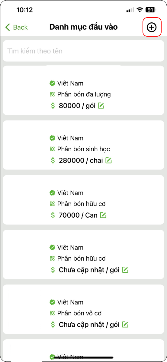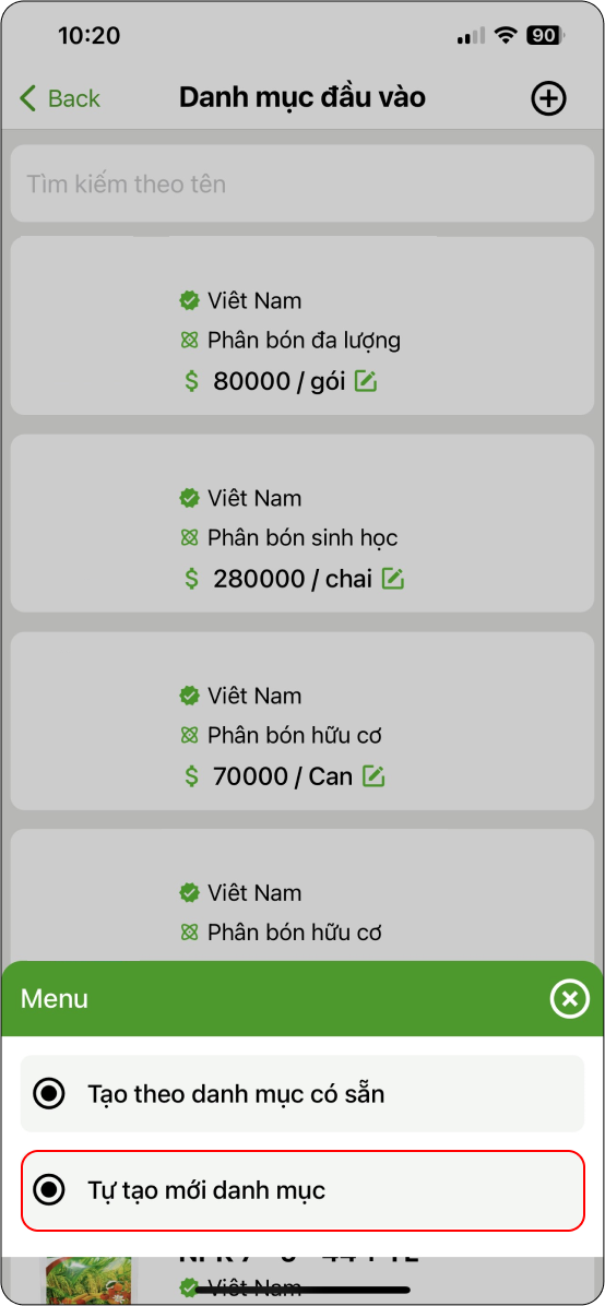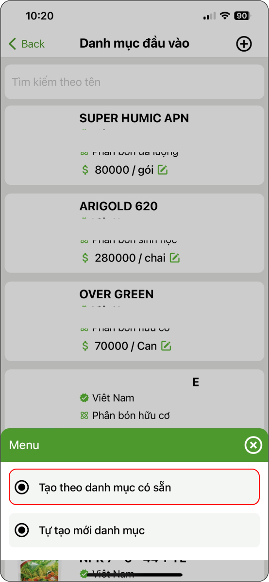 Chọn “Quản lý đầu vào” (Hình 1) → chọn “Danh mục đầu vào” (Hình 2) → Nhấn vào biểu tượng dấu (+) (Hình 3) → Nhấn vào “Tạo theo danh mục có sẵn” (Hình 4).