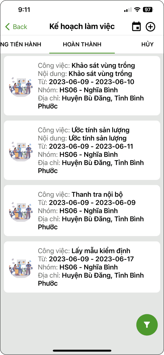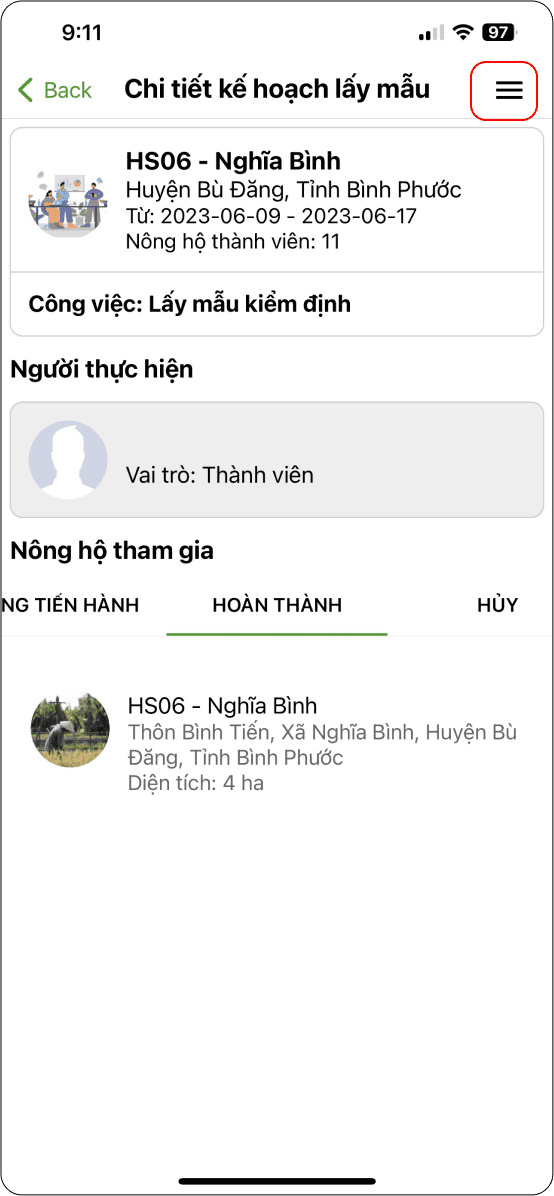 B9: Tại màn hình “Chi tiết kế hoạch lấy mẫu” (Hình 1) → Chọn biểu tượng đa nhiệm (Hình 1) → Chọn “Chuyển sang trạng thái hoàn thành” (Hình 2) → Trạng thái của lịch làm việc được cập nhật trại trạng thái hoàn thành Kế hoạch làm việc. (Hình 3 và Hình 4).
