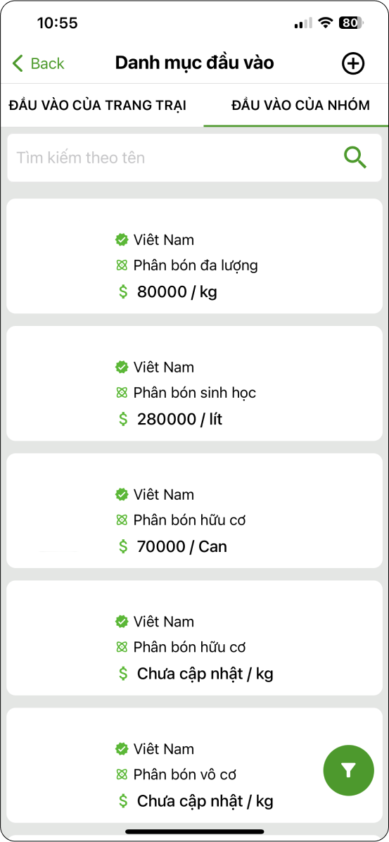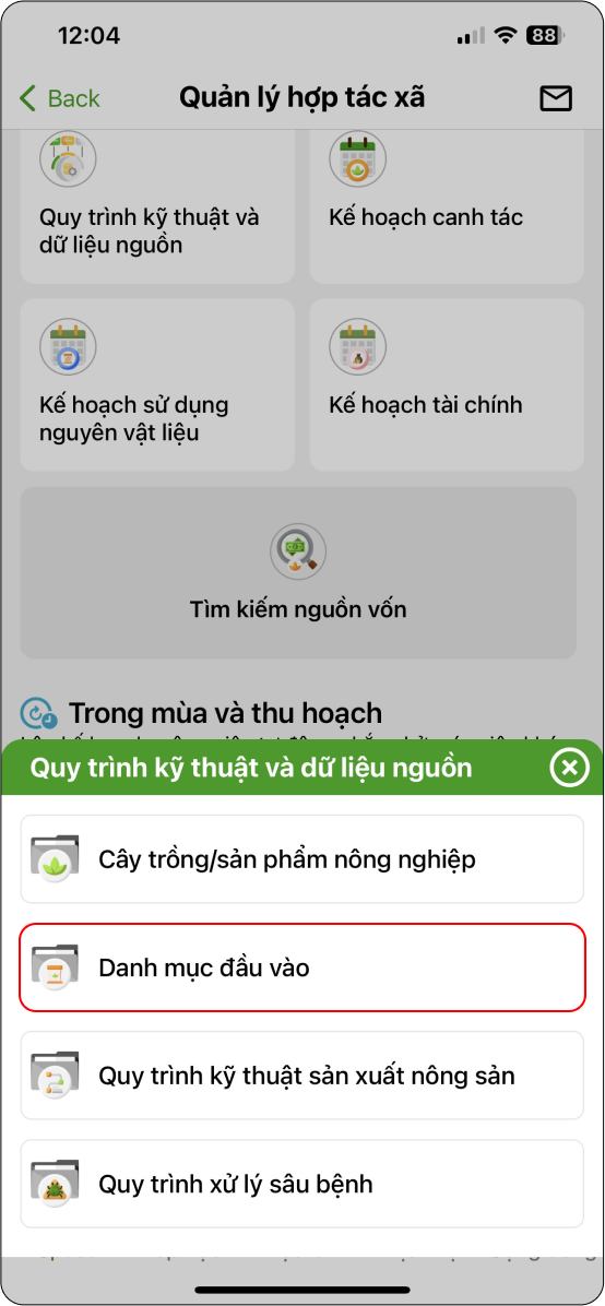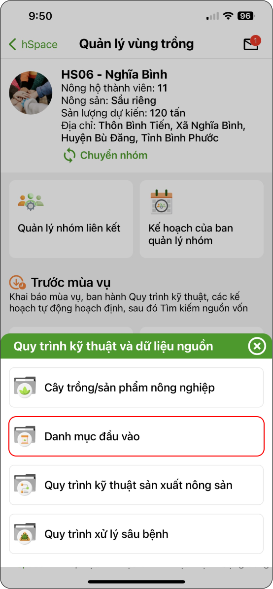 B2: Nhấn vào “Quản lý đầu vào” (Hình 1) → nhấn vào “Danh mục đầu vào” (Hình 2) → nhấn vào “Đầu vào của nhóm” (Hình 3).