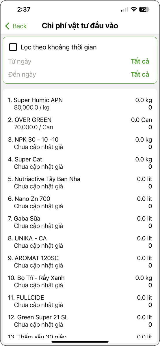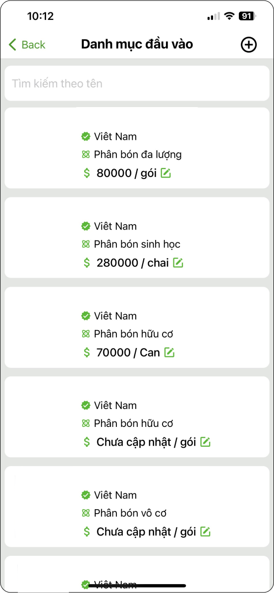 - Nếu trong công việc có sử dụng vật tư đầu vào, hệ thống hiển thị bảng sử dụng vật tư đầu vào, nông hộ có thể chỉnh sửa số lượng theo thực tế sử dụng (Hình 9).