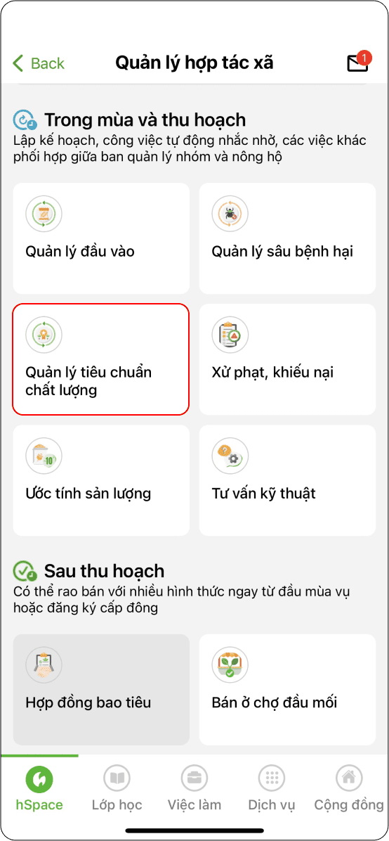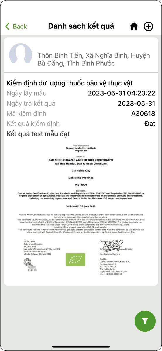 B11: Tại màn hình Quản lý trang trại (Hình 1) → Chọn “Quản lý tiêu chuẩn chất lượng” (Hình 2) → tiếp tục chọn “Kết quả phân tích dư lượng thuốc BVTV”.