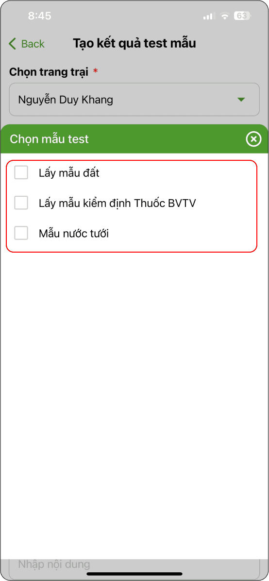 → Chọn trang trại đã thực hiện lấy mẫu (Hình 5) → Chọn mẫu test của trang trại (Hình 6).