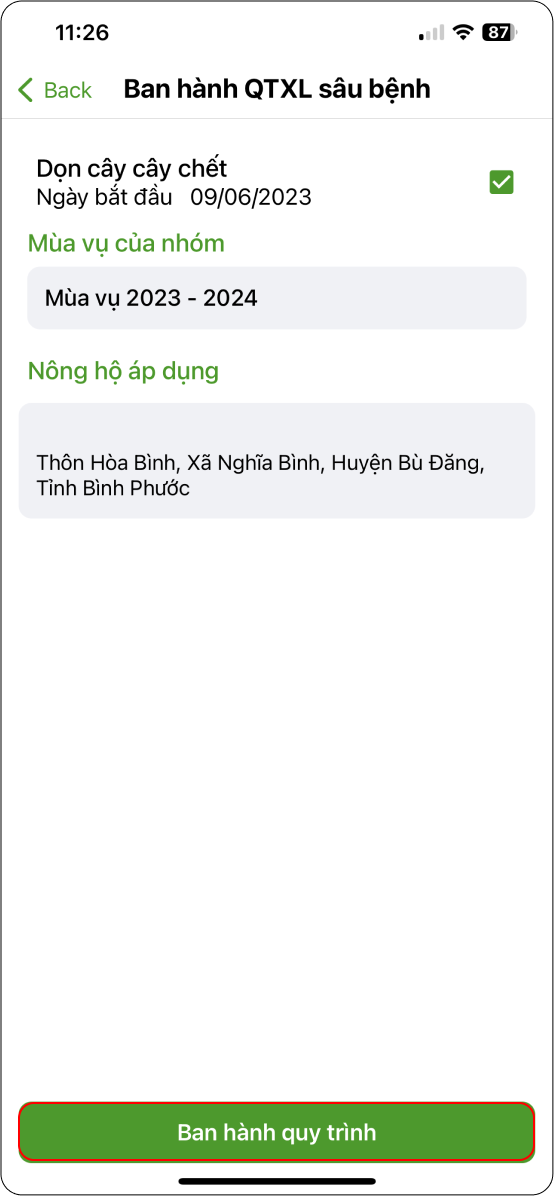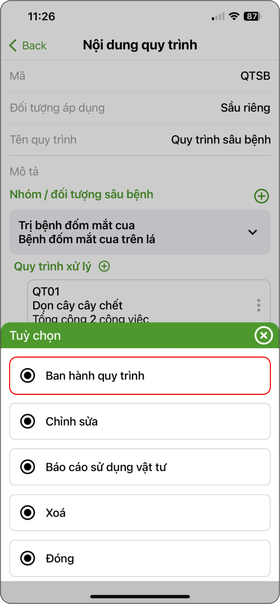 → Chọn quy trình xử lý sâu bệnh (Hình 3) → Ấn và giữ giai đoạn hoặc quy trình muốn ban hành (Ảnh 4) → Ban hành quy trình (Ảnh 5).