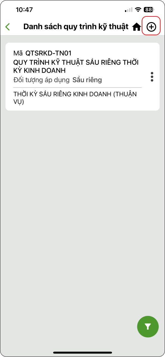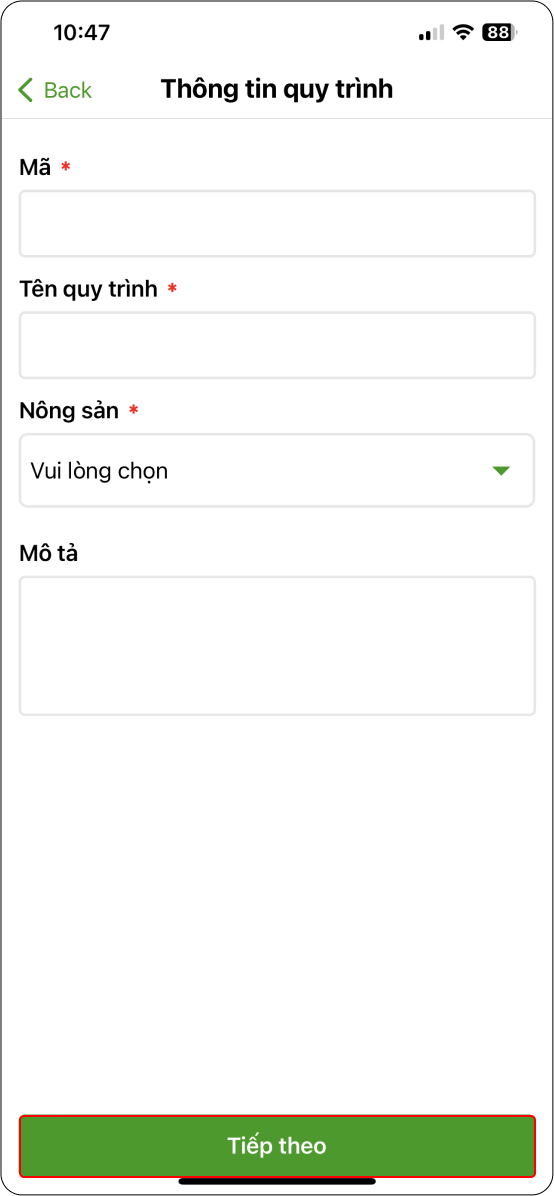 B1: Nhấn vào “Quy trình kỹ thuật và dữ liệu nguồn” (Hình 1) → Nhấn vào “Quy trình sản xuất nông sản” (Hình 2) → Nhấn vào dấu (+) (Hình 3) → Điền thông tin và nhấn “Tiếp theo” (Hình 4).