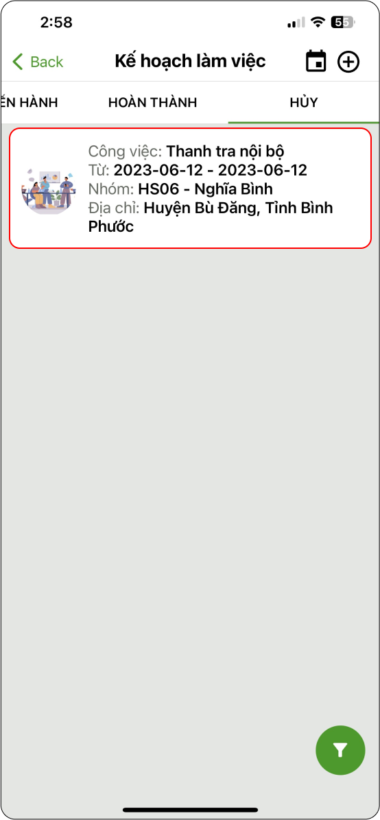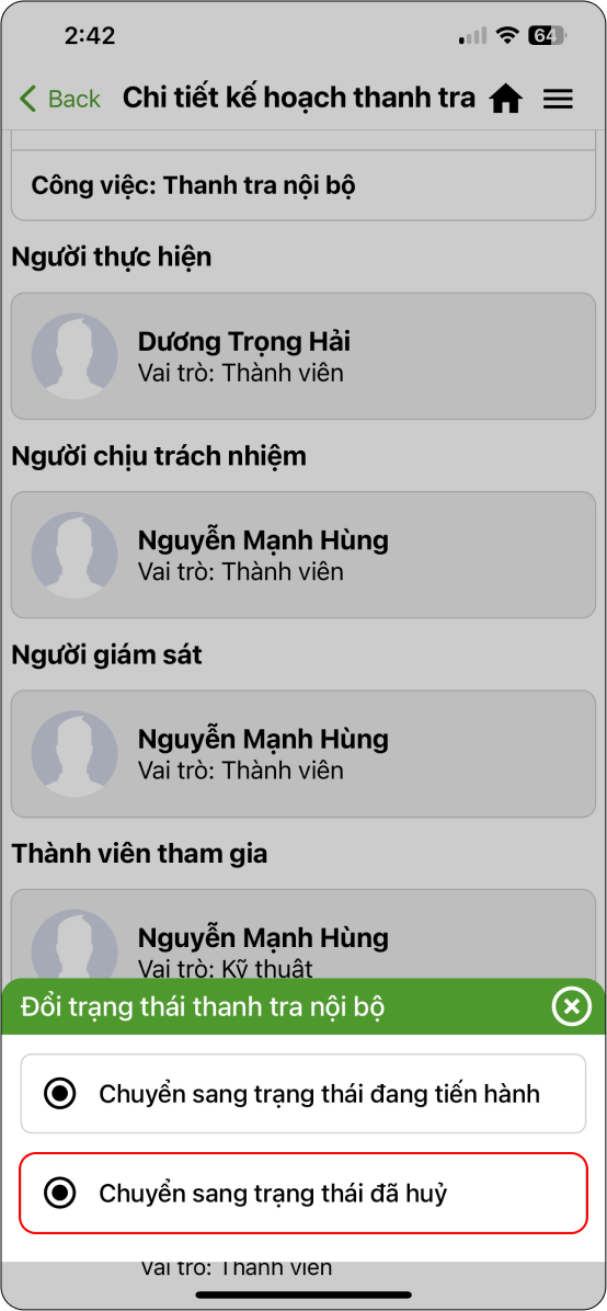 → Chuyển sang trạng thái đang tiến hành. ( Hình 1). Trạng thái lịch thanh tra là “Đang tiến hành”