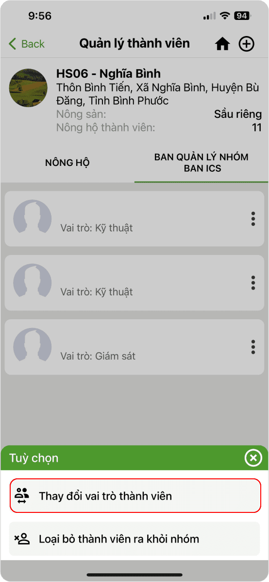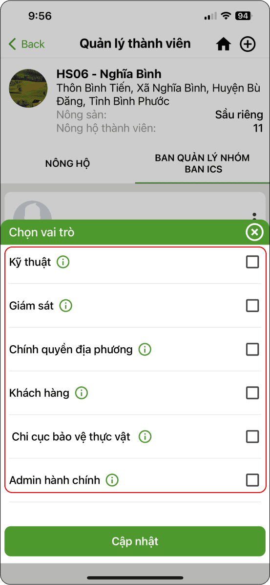 → Chọn trang trại (Hình 6) → Chọn vai trò Nông hộ thành viên (Hình 7) → Nhập lời mời và Gửi (Hình 6)