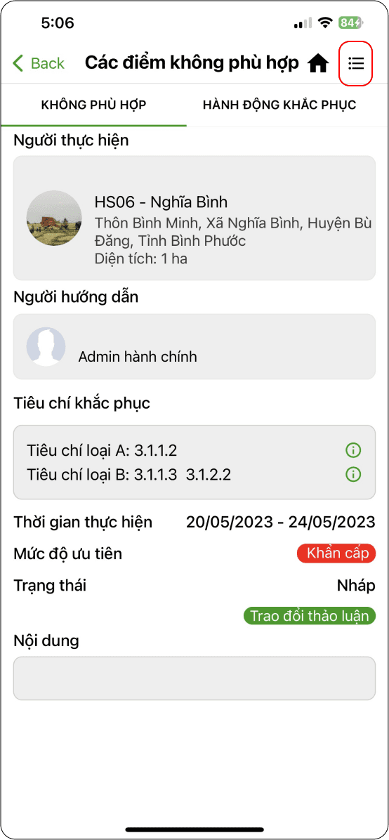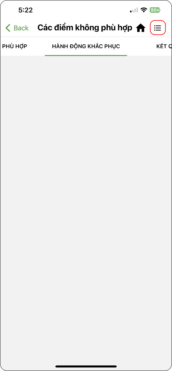 → Chi tiết một điểm không phù hợp: Không phù hợp, Hành động khắc phục, Kết quả.