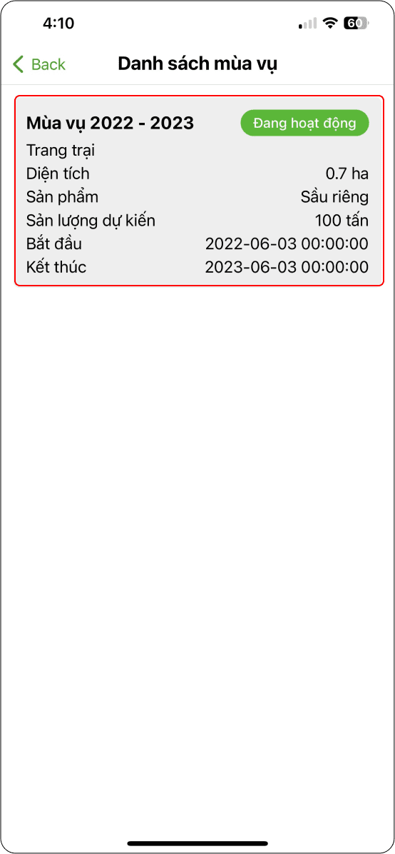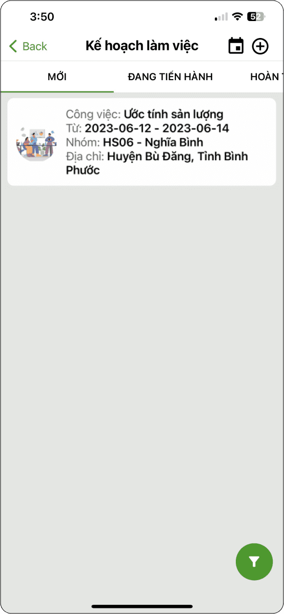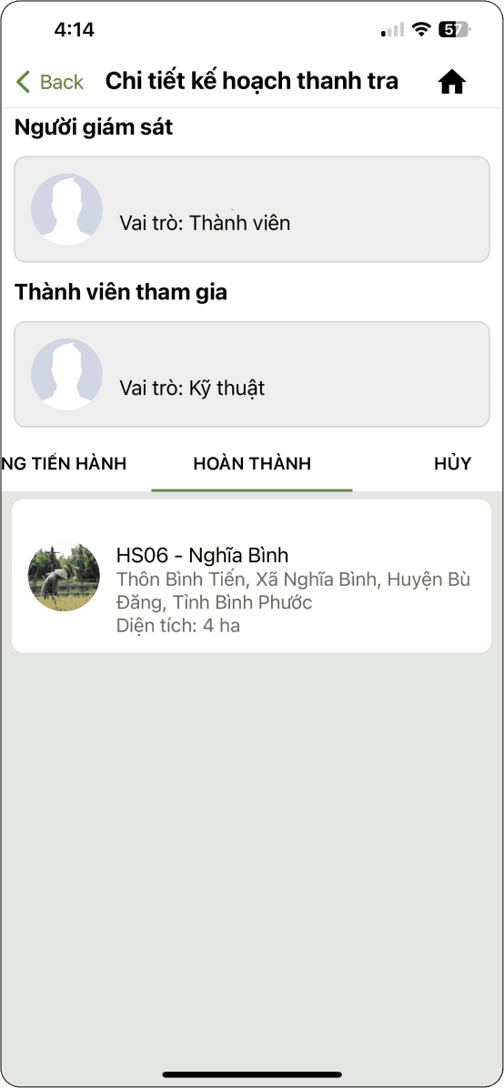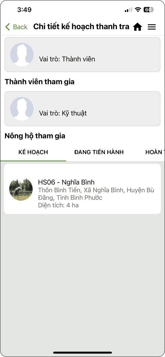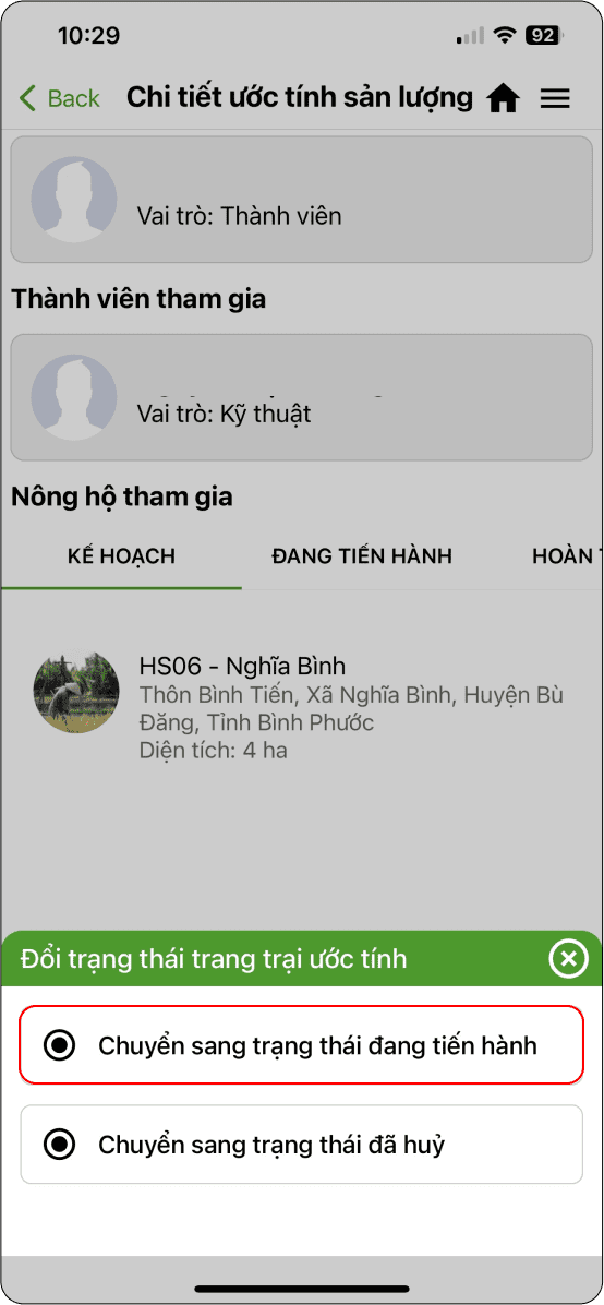 Hiển thị danh sách nông hộ tham gia ước tính sản lượng và trạng thái trang trại ban đầu là “Kế hoạch: (Hình 2).