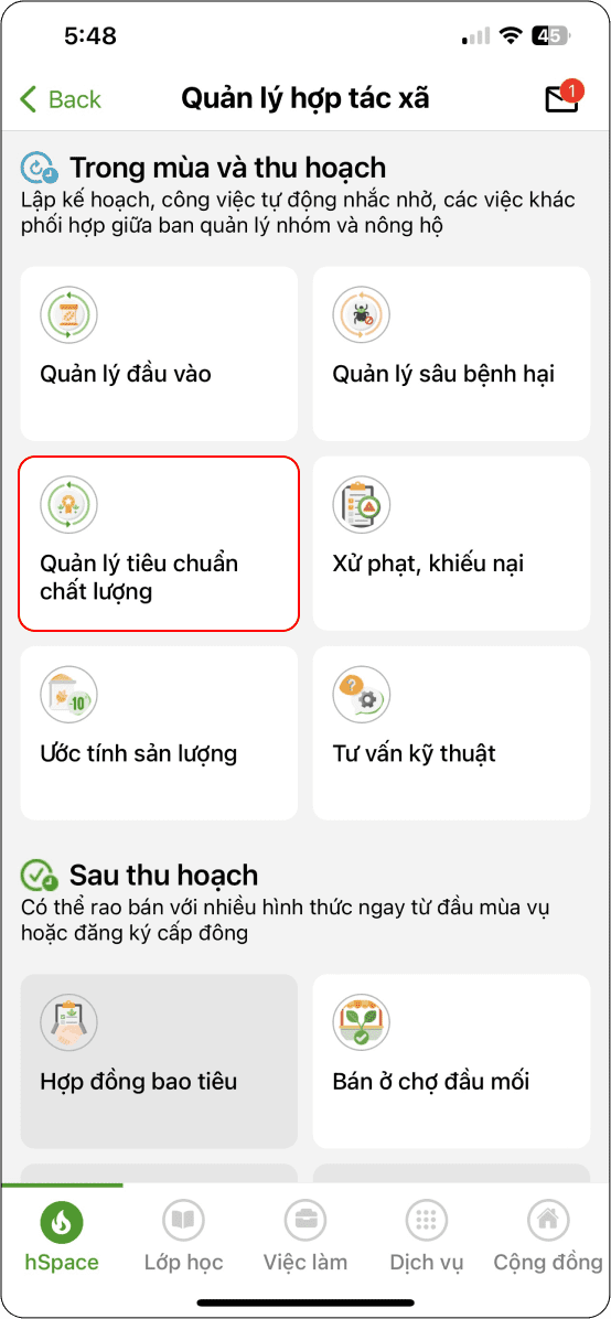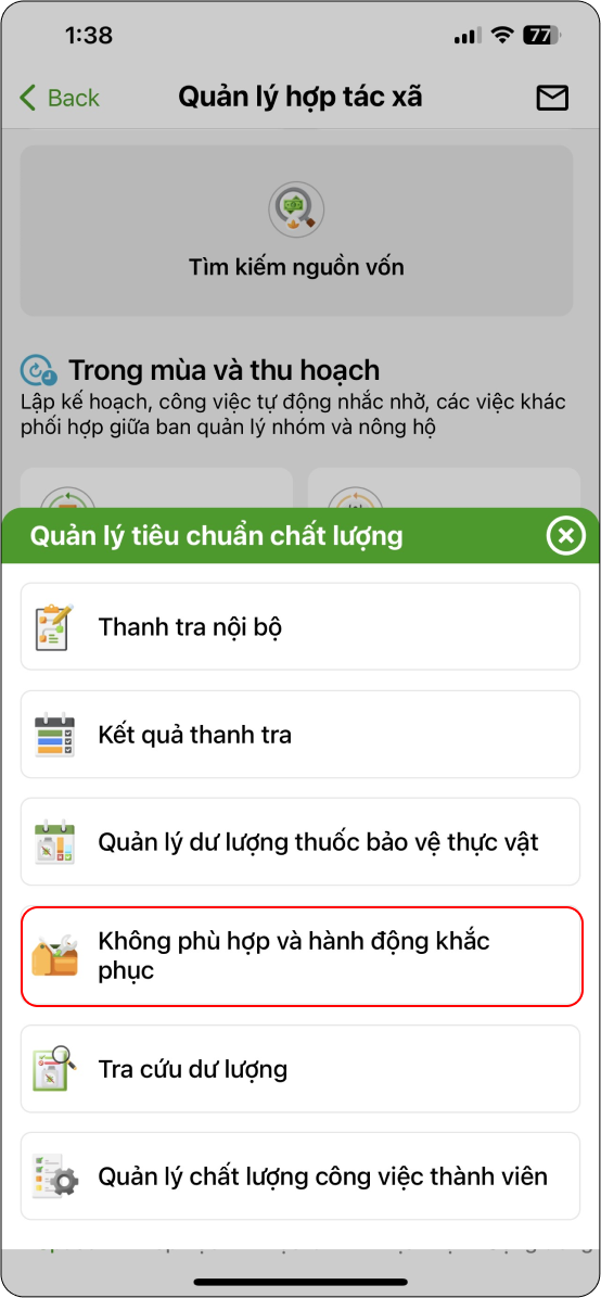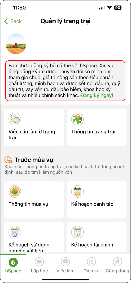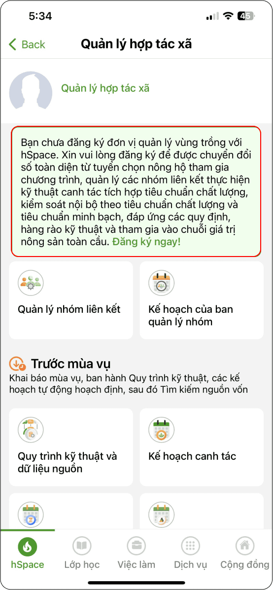 Đăng nhập thành công ứng dụng → chọn “Quản lý hợp tác xã” (Hình 11) → Phần nhắc nhở đăng ký (Hình 2)