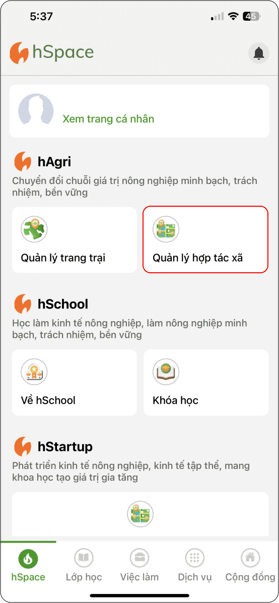 Tại màn hình “Quản lý trang trại” → Chọn phần nhắc nhở tham gia nhóm → Chọn “tham gia nhóm liên kết cơ sở hStartup” → Hệ thống hiển thị nhóm cơ sở tại địa phương.