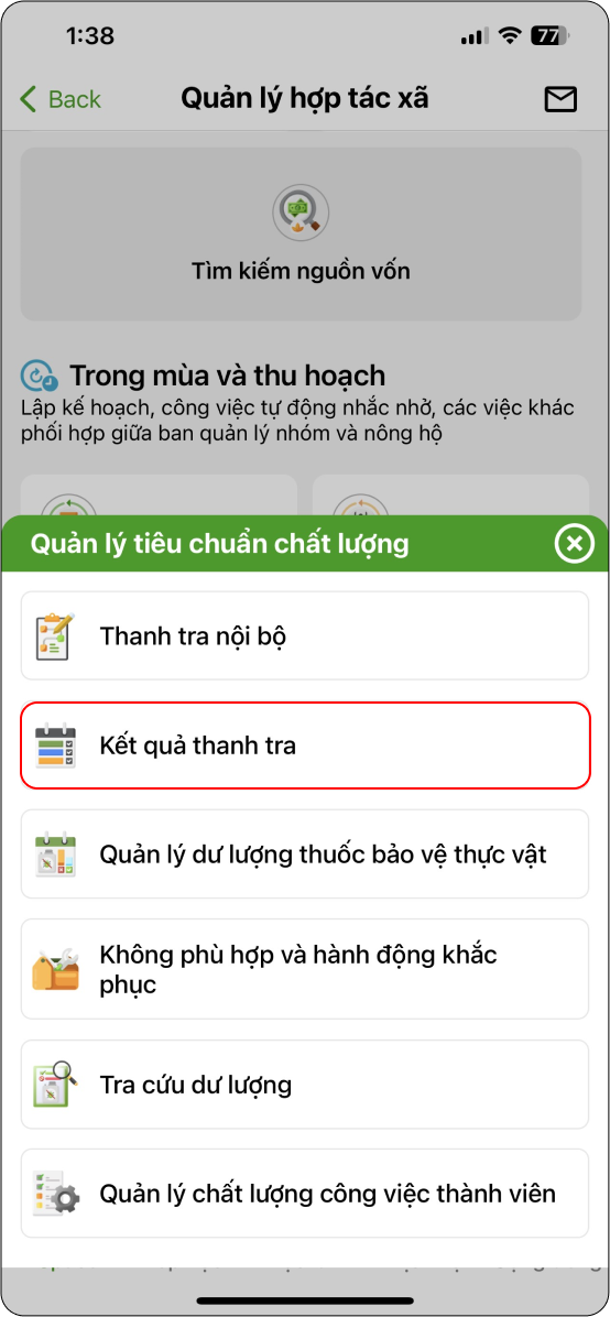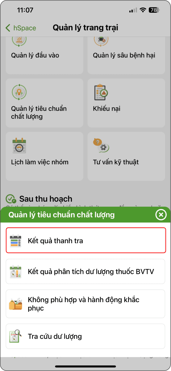 B9: Chọn “Quản lý tiêu chuẩn chất lượng” (Hình 1) → Kết quả thanh tra (Hình 2) → Chọn mùa vụ trang trại (Hình 3) → Chi tiết kết quả đánh giá (Hình 4)