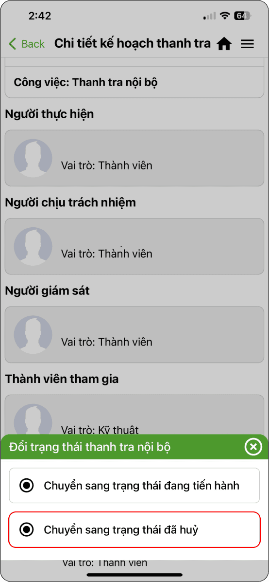 B5: “Kế hoạch của ban quản lý nhóm” → chọn kế hoạch cần Hủy → Chuyển sang trạng thái hủy