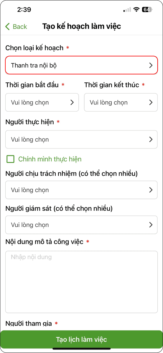 B3: Chọn “Kế hoạch của ban hành lý nhóm” (Hình 1) → Chọn biểu tượng dấu “+” (Hình 2) → Nhập đầy đủ thông tin yêu cầu → Tạo lịch làm việc (Hình 3) → Hoàn thành tạo lịch làm việc (Hình 4)