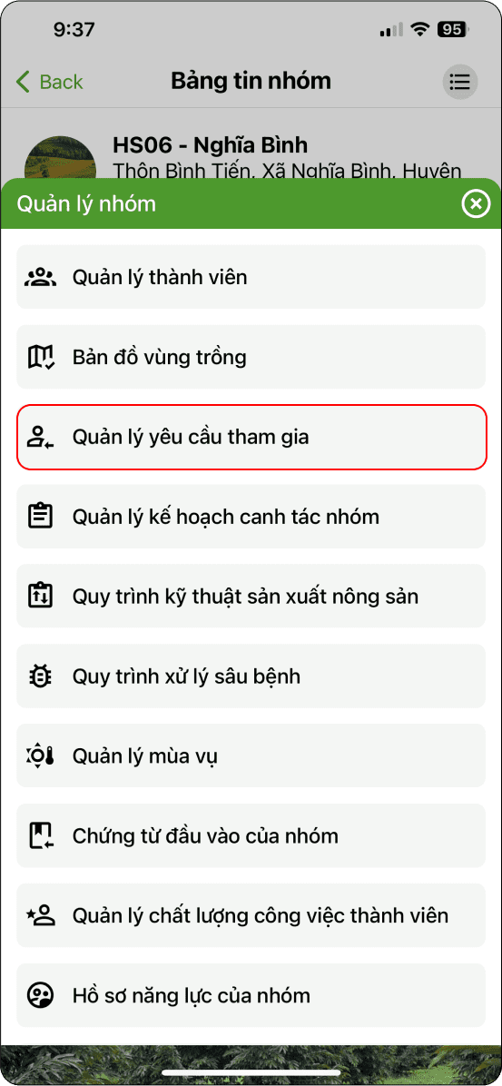 Để tham gia nhóm liên kết hộ viên, ban quản lý nhóm hoặc người giới thiệu phải cung cấp cho nông hộ mã tham gia của nhóm, sau khi có mã tham gia nhóm nông hộ thực hiện các bước sau: